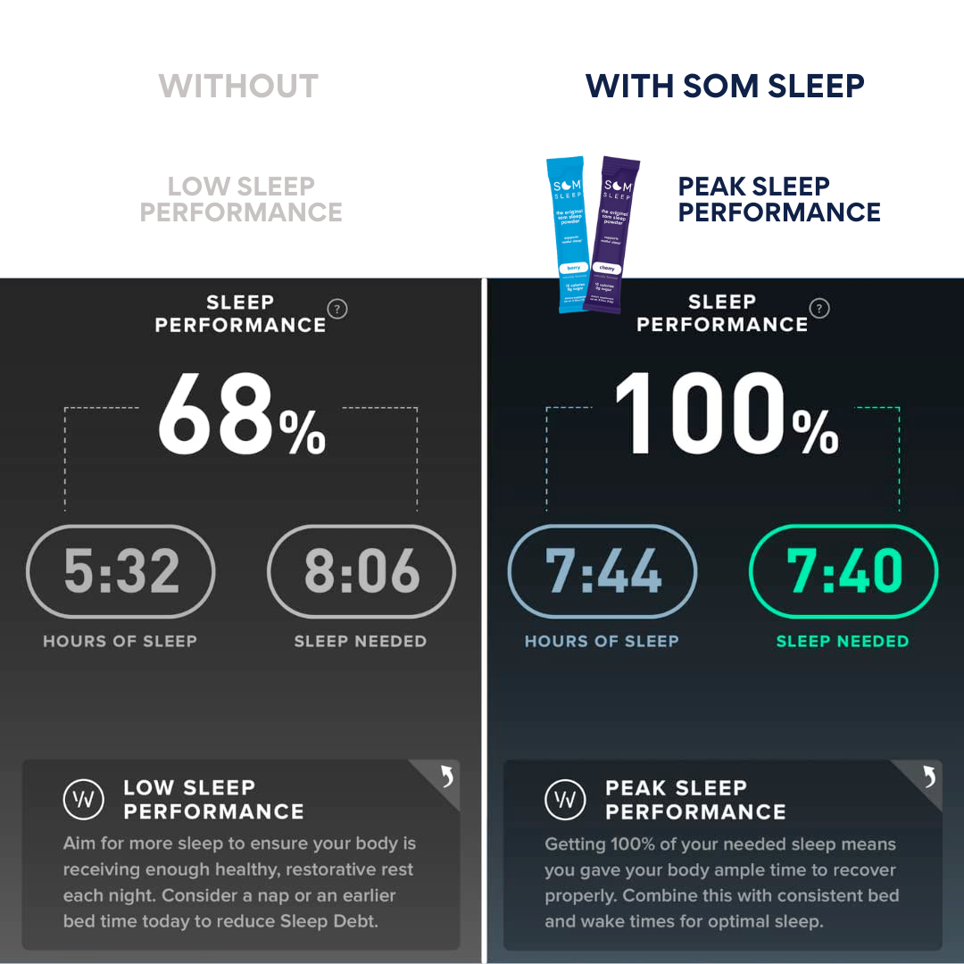 Our formula includes ingredients that are naturally found in your body, a healthy diet, and green tea. They work in harmony to help put you to sleep quickly* and wake you up feeling great, without the groggy, hangover feeling of sleep aids. Rest easy knowing Som Sleep is drug-free, non-habit forming, and NSF Certified for Sport.