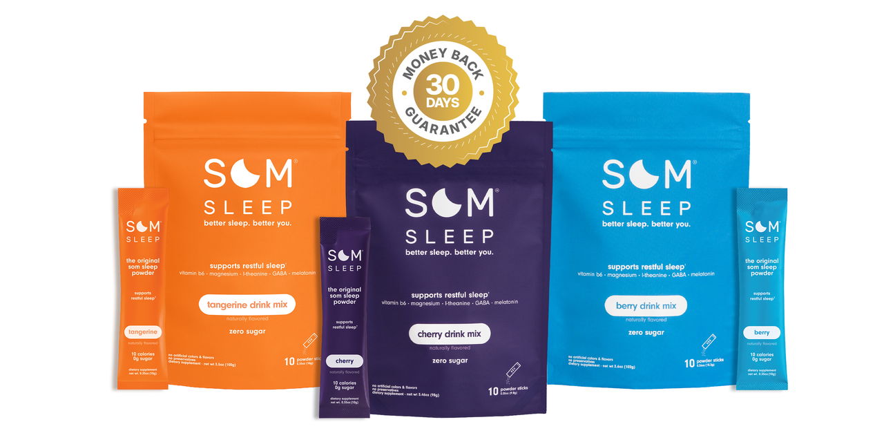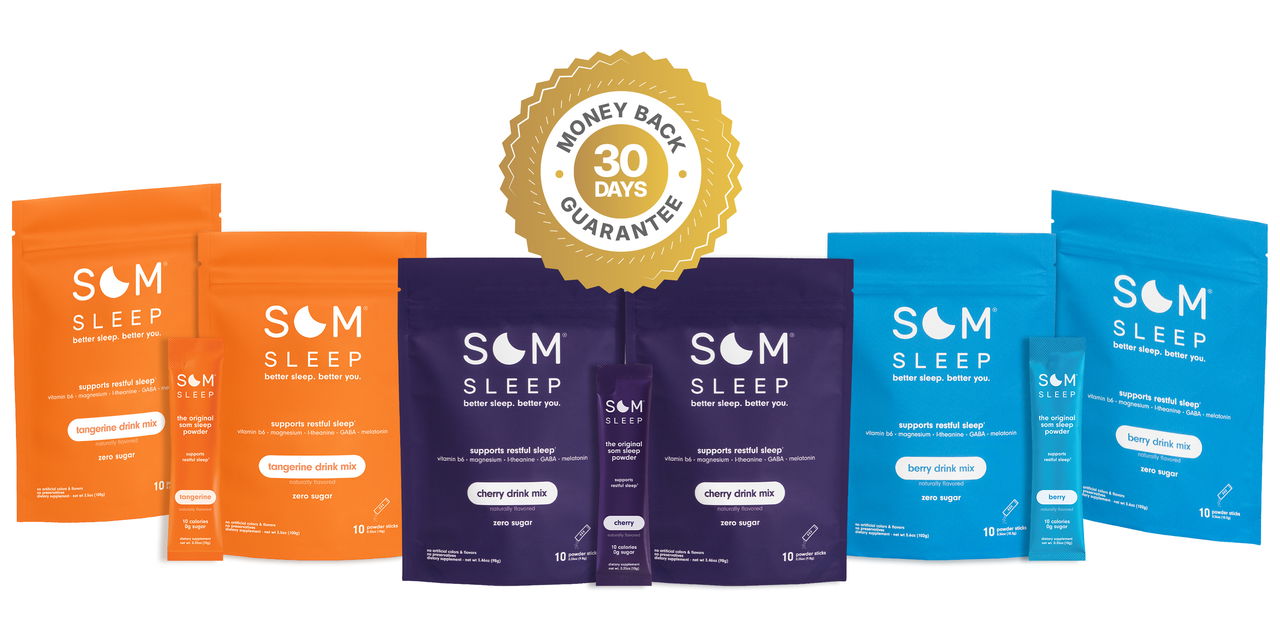Our formula combines the perfect balance of ingredients that work in harmony to help you fall asleep quickly and wake up feeling great, without the groggy, hangover feeling of sleep aids. Som Sleep addresses sleep from three angles to provide a more complete solution.